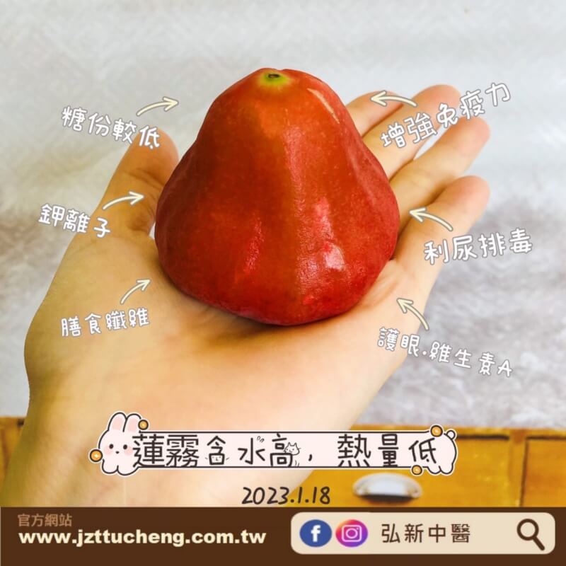 蓮霧果皮色澤深紅,富含膳食纖維、醣類、維生素C、鉀等營養素,含有鉀,有助於維持細胞健康、平衡體內電解質與酸鹼值,蓮霧還有潤肺、止咳、除痰、開胃、幫助消化的作用。