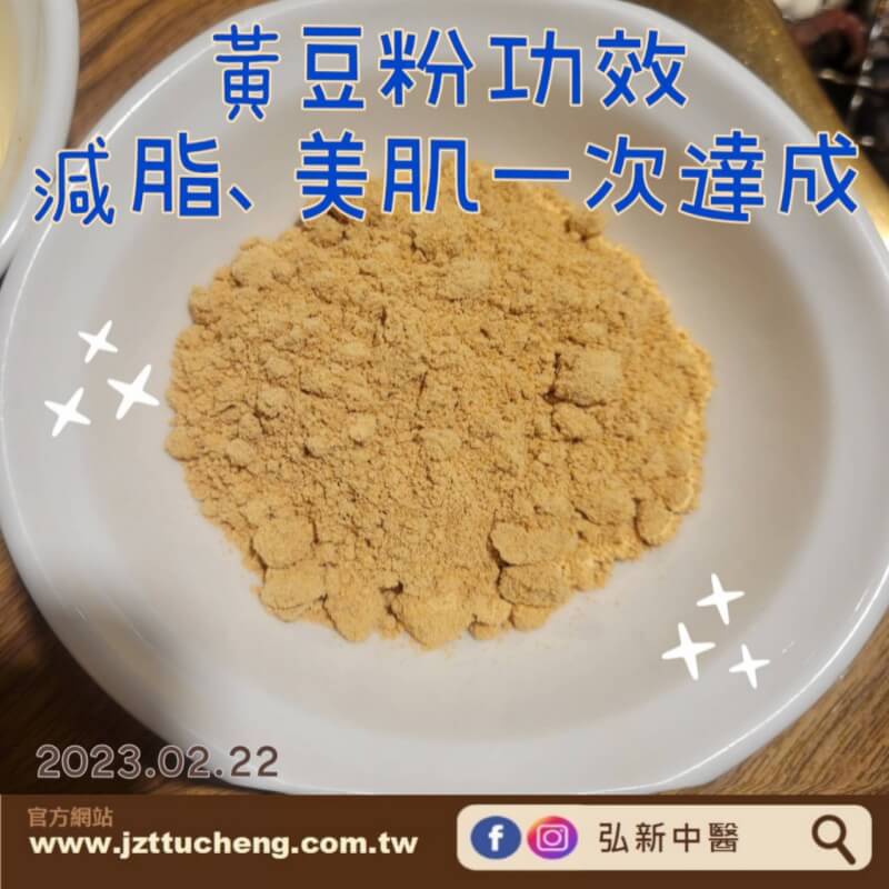 熱量低的黃豆粉富含大豆異黃酮、鈣質、食物纖維與大豆寡糖。異黃酮能促進女性荷爾蒙分泌,具有「豐胸」、「改善更年期不適」等效能;也可提高代謝,讓脂肪燃燒,有效瘦身;同時也能促進抗氧化作用,可以美肌。食物纖維與大豆寡糖則能促進腸道蠕動,預防便秘。