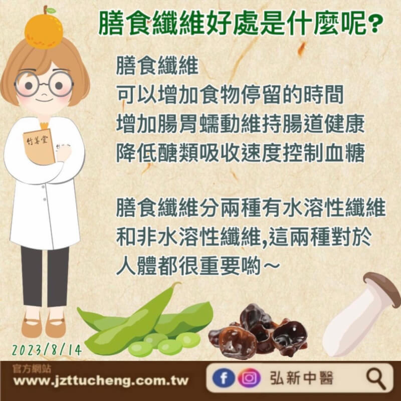 膳食纖維可以增加食物停留的時間.增加腸胃蠕動維持腸道健康,降低醣類吸收速度控制血糖,膳食纖維分兩種有水溶性纖維和非水溶性纖維,這兩種對於人體都很重要,那好處有什麼呢~