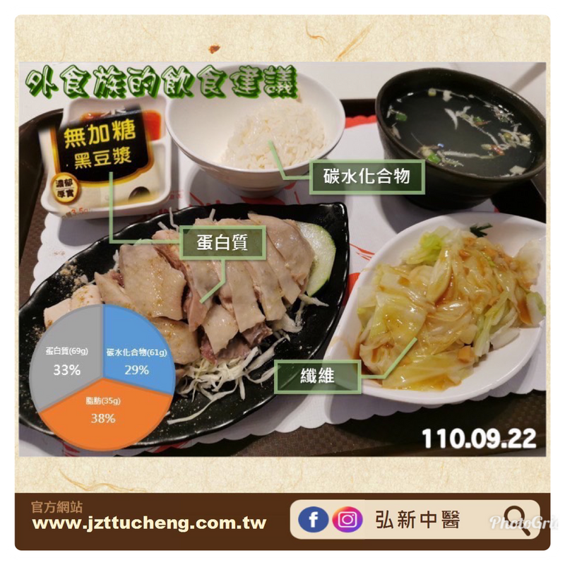 「白飯減半,降低碳水的比例,喝豆漿增加蛋白質攝取,這兩個觀念不錯,再把雞皮去掉降低脂肪攝取會更好。套餐的高麗菜份量不足,可再加一份超商的生菜沙拉或水果,拉高纖維攝取量」