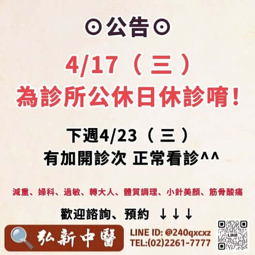 休診公告:4/17為診所休診日唷~