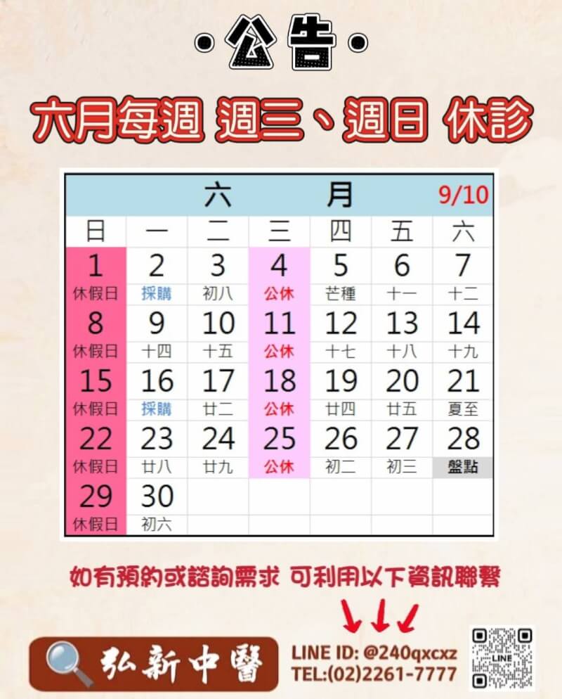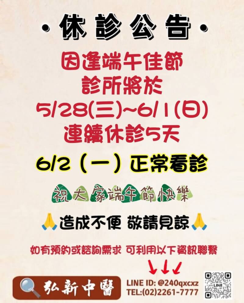 休診公告:5/28(三)~6/1(日)端午連假休診5天唷~