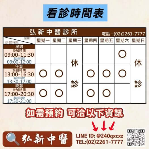 各位親愛的顧客您好~最近小編收到不少初診預約需要確認門診時間~小編貼心提供目前看診時間表給大家參考唷~弘新中醫診所關心您新北市土城區裕民路280號3樓 (02)2261-7777官方LINE ID: @240qxcxz官方Facebook https://www.facebook.com/share/12J7C6KswKw/一起玩IGhttps://www.instagram.com/jzt_tucheng?igsh=MWY1amI1eDV5bmVpZA==#中醫 #減重 #減肥 #埋線 #雕塑 #調理 #轉大人 #過敏 #產後調理 #內科調理 #三伏貼 #土城 #張博翔 #弘新中醫