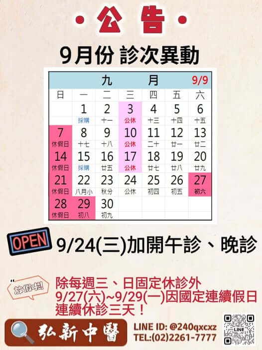 公告:9月診次異動 https://www.facebook.com/share/12J7C6KswKw/一起玩IGhttps://www.instagram.com/jzt_tucheng?igsh=MWY1amI1eDV5bmVpZA==#中醫 #減重 #減肥 #埋線 #雕塑 #調理 #轉大人 #過敏 #產後調理 #內科調理 #三伏貼 #土城 #張博翔 #弘新中醫